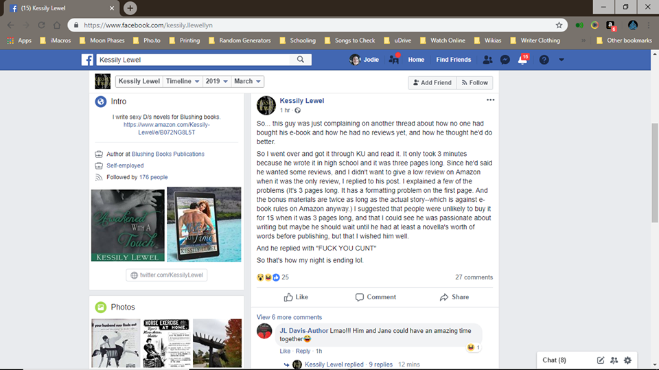 It is also notable that LT Marshall did not read the book. She actually bought it on Kindle as opposed to Kindle Unlimited, but then she asked for a refund, which is only allowed if you can prove you haven't read it, which she did. She did that because, at that time, it wasn't available on Kindle Unlimited. So much for Kessily claiming to have bought it, LT Marshall was my first sale...